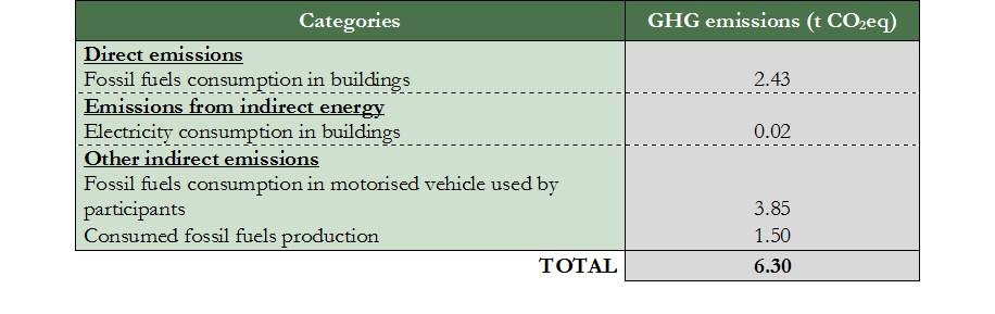 With before and after the event gathered data, GHG emissions were quantified and represent 6.3 tons of CO2eq. Here is an overview of emissions by categories:
