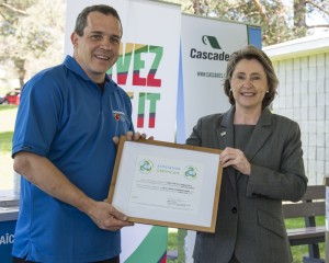 Remise de l’attestation Carboresponsable par Mme Manon Laporte à M. Patrice Cordeau, directeur du service de développement durable aux Jeux d’été du Canada 2013 – Sherbrooke